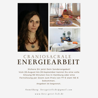 DU hast einen Raum für mich und hilfst mir dabei die richtigen Menschen zu finden, die sich von meiner Arbeit gerufen fühlen; dann erhältst du ab 3 verbindlichen Buchungen, deine eigene craniosacrale Lichtsitzung kostenlos.
